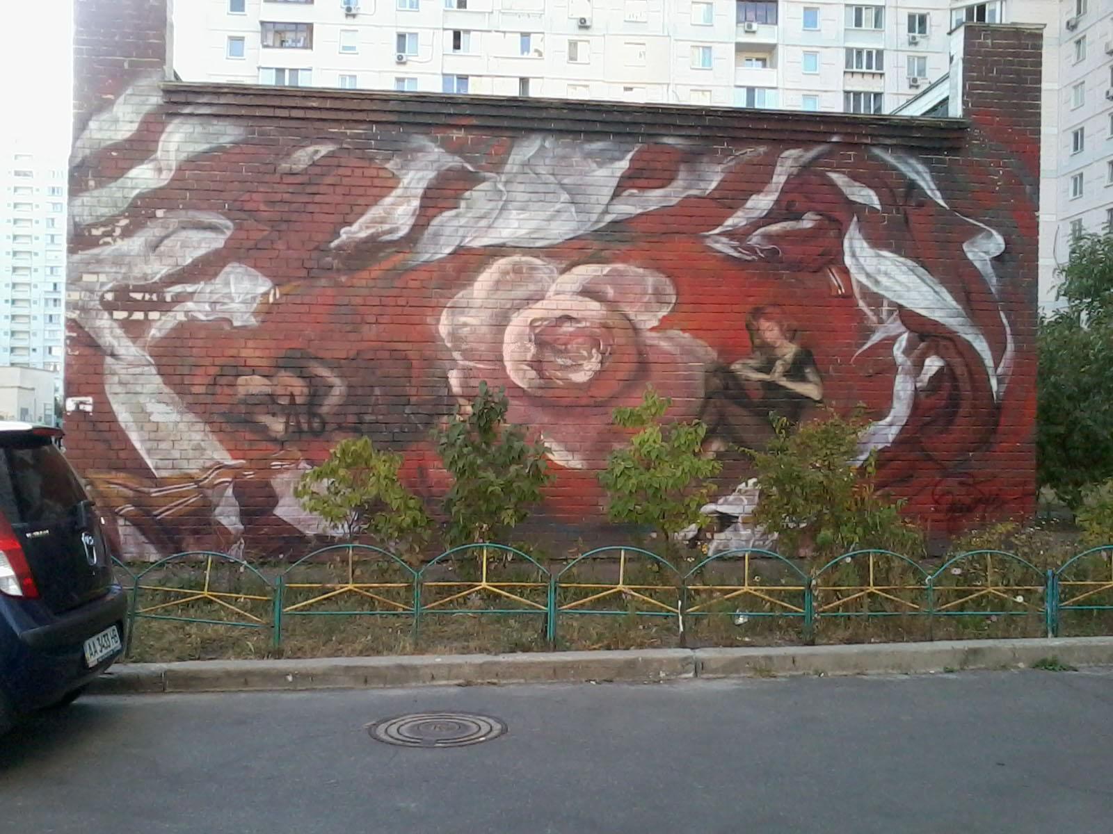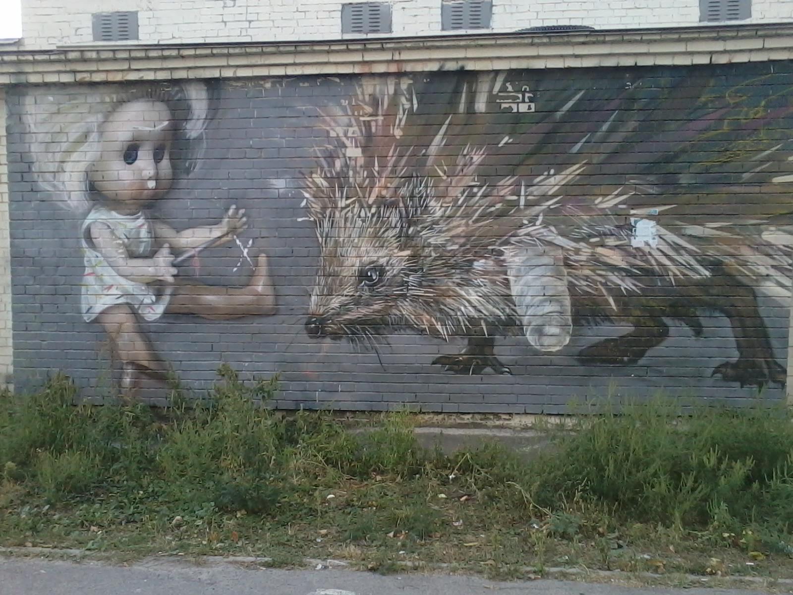 Киев основательно изгажен надписями и неталантливыми примитивными рисуночками. Я считаю, властям с этим надо что-то делать, и виновным просто отбивать руки. Но некоторые муралы, "разрешенные", "регламентированные", нарисованные во время фестивалей стрит-арта, очень неплохи. Как эта работа, на фото выше. Это мурал группы "Interesni Kazki" возле Индустриального моста.